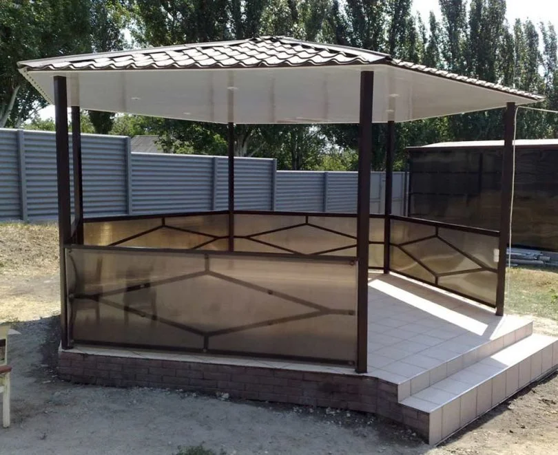 - поликарбонат. Срок службы этого материала не большой, так как устойчивость к перепадам температур и атмосферных осадков низкая. Преимущественно применяется для разборных беседок;