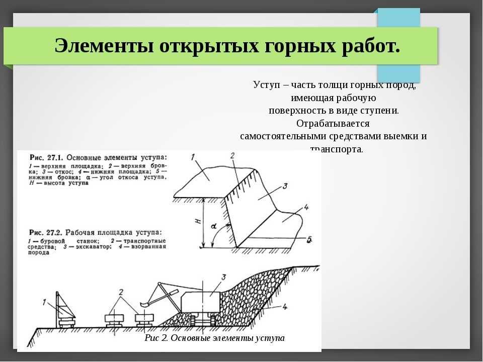 Различают следующие элементы уступа (рис. 144, б): 1 — нижняя площадка (берма); 2 — нижняя бровка; 3 — верхняя бровка; 4 — верхняя площадка; 3—2 — откос; а — угол откоса: h — высота.Нижняя и верхняя площадки (бермы) — горизонтальные плоскости уступа, ограничивающие его по высоте. Нижнюю площадку (берму) называют также подошвой уступа.Откос уступа — наклонная плоскость уступа, ограничивающая его со стороны выработанного пространства.Верхняя и нижняя бровки — соответственно линии пересечения верхней и нижней площадок (берм) с откосом уступа.Угол откоса уступа зависит от применяемого способа выемки и составляет обычно 60-80° (для нерабочих уступов 45-60°).Различают площадки (бермы) рабочие, нерабочие и предохранительные.Рабочая площадка (берма) — площадка, на которой размещают буровые станки, экскаваторы, транспортные средства и другое горнотранспортное оборудование. Ее ширина бывает от 30 до 70 м и зависит от типа оборудования, схемы его размещения и от высоты уступа.Нерабочая площадка (берма) — площадка, на которой не размещается ни горное, ни транспортное оборудование и не ведутся работы.Предохранительная площадка (берма) образуется в результате недоработки нижнего уступа по отношению к верхнему. Ее назначение — предохранение карьера от обрушения (сползания) отработанных уступов, а главным образом — от падения с уступов отдельных отслаивающихся кусков породы. Минимальная ширина этих площадок по правилам безопасности должна быть не менее 0,2 высоты уступов, непосредственно прилегающих к ним; через каждые 30 м необходимо оставлять площадки шириной не менее 6 м.Высота уступа зависит прежде всего от размеров применяемых машин и способа ведения горных работ, а также от ряда других факторов. Значительное влияние на высоту и угол откоса уступа оказывают водоносность пород и климатические условия.