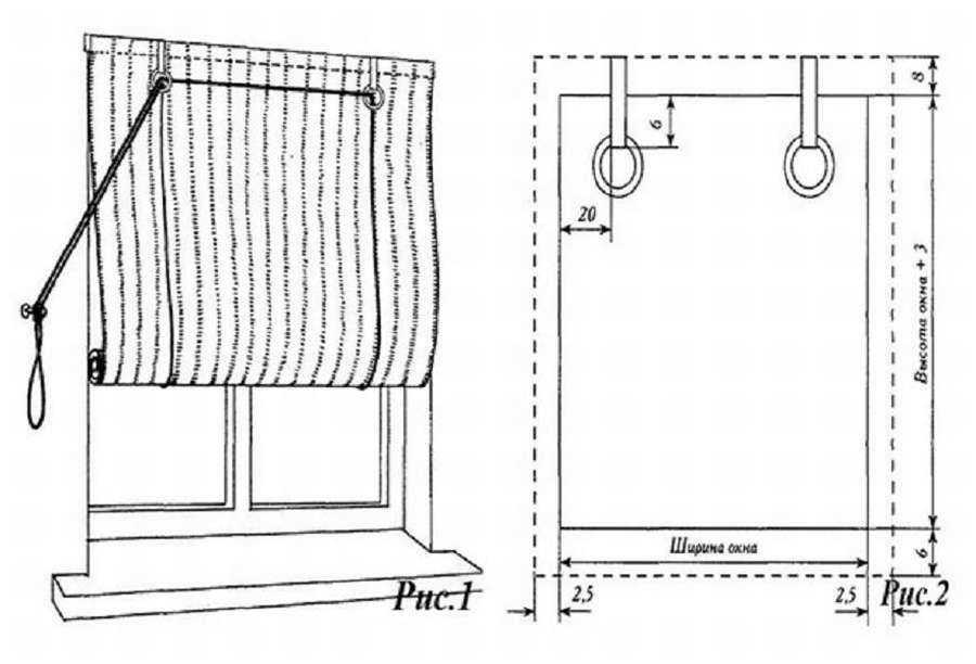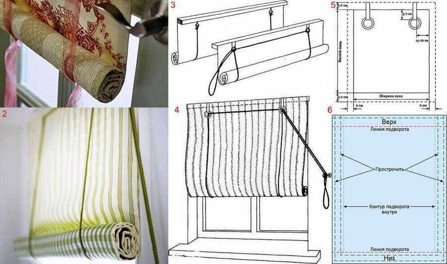 Такие жалюзи можно сделать легко самостоятельно, использовав ткань и ленты для сворачивания жалюзи. Сама конструкция проста и понятна благодаря имеющейся схеме.