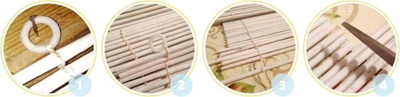 - Начинаем связывать трубочки друг с другом: складываем длинную верёвочку пополам, приматываем к ней колечко для крепления на окно, завязываем один-два узелка, затем обвязываем первую трубочку и так же делаем 1-2 узелка, берем вторую и повторяем действия, пока все трубочки не свяжутся. Затем приступаем к связыванию трубочек с противоположного края, но это можно делать и параллельно с первым рядом.