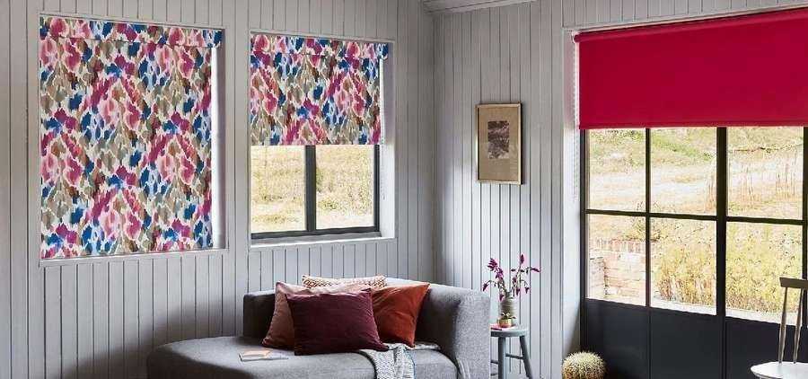 Три окна, каждое из которых имеет свой цвет жалюзи, пять здесь сделан акцент на цвет, а конструкцию выбираем простую, но функциональную.