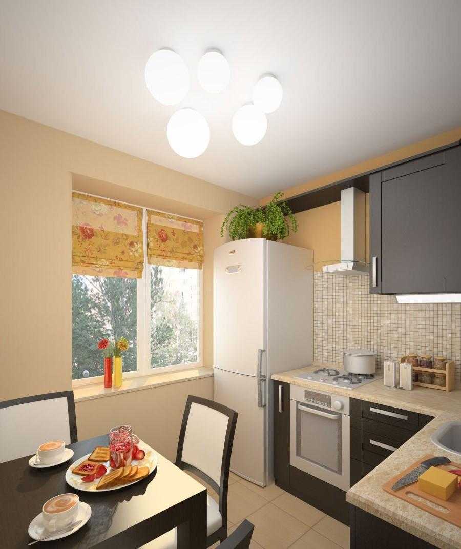 Как уже было сказано выше, габаритные предметы крайне нежелательны на маленькой кухне, поэтому о большой красивой люстре следует забыть. А вот люстра средних размеров вполне подойдет, тем более габариты кухни позволят осветить все пространство всего одной лампой.