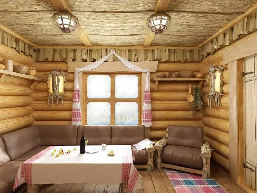 Традиционный русский стиль предполагает использование натуральной деревянной отделки. Парилку оборудуют печкой, а в предбаннике используют резной декор и пестрые половики на полу. В комнате отдыха стол украсит скатерть и самовар, плетеные корзины и короба. Мебель самая простая – стол и скамьи с вышитыми половичками
