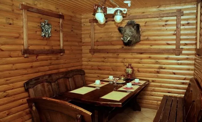 - Стиль шале более сдержанный. Если кантри и русский стиль допускают резной декор, то здесь упор делается на женскую или мужскую энергетику интерьера. В первом случае в качестве декора для комнаты отдыха используют холодное оружие на стенах, ружья, трофей, кованый декор, как бы намекая, что эта баня принадлежит охотнику. Если хозяйка – женщина, то интерьер украшают картинами с изображением пейзажей, керамическим чайным сервизом, вышитыми скатертями и салфетками, венками из душистых трав и букетиками высушенных цветов.