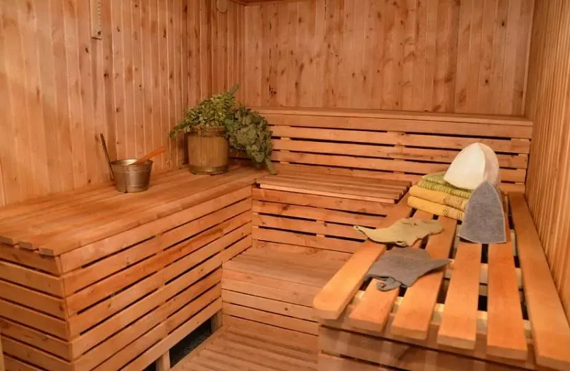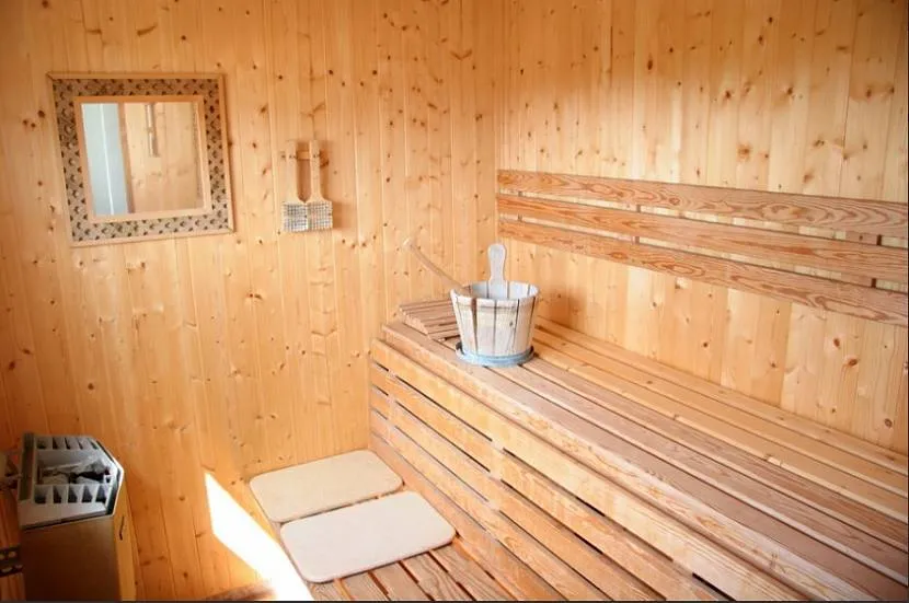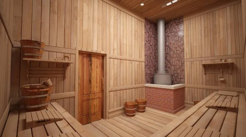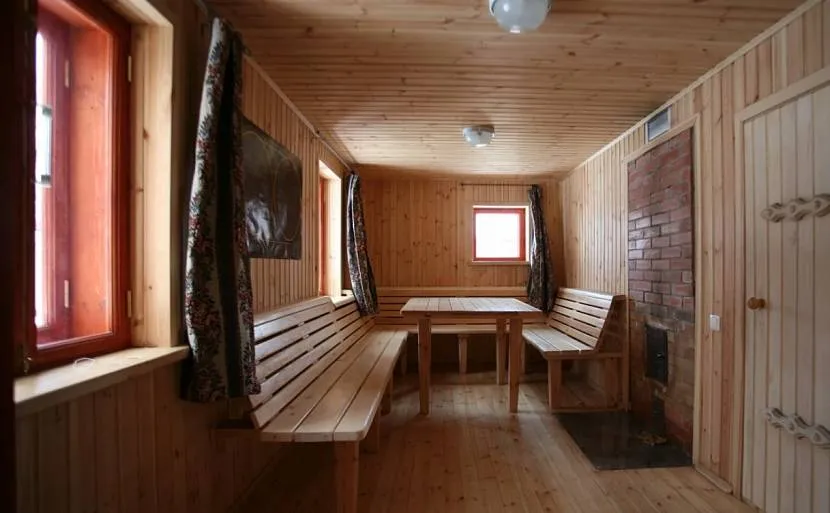 В этом помещении используют дерево. Конечно, постоянная жара и влажность не способствуют долговечности этого материала, поэтому следует подбирать древесину максимально прочных сортов: