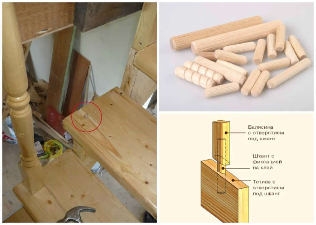 Установка столбов с балясинами считается сложной задачей, где требуется точная разметка с подгонкой. В ступеньке отверстие для шканта размечается на расстоянии от края, равном ½ ширины основания балясины. Затем на ступенях делают отверстия и вклеивают в них шканты (они должны выступать на 1-1,5 см от поверхности).