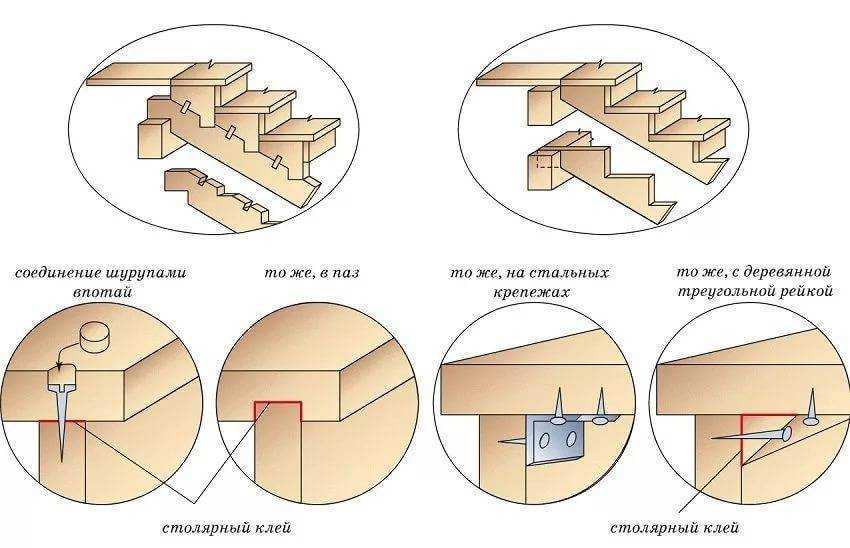 После фиксации подступенков устанавливаются заранее фрезерованные ступени, длина которых должна превышать расстояние между парой крайних косоуров на 1-2 см. Ширина элементов должна быть на 2-3 см больше гребеночного выступа. Крепление ступеней к подступенкам и косоурам осуществляется на саморезы, шляпки которых должны быть утоплены в дерево.