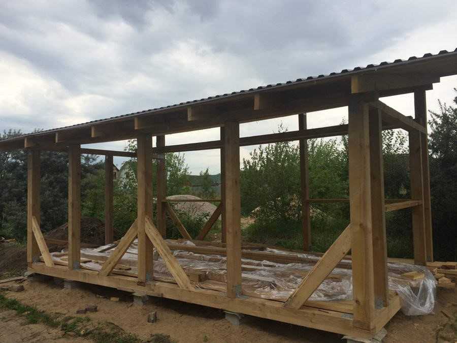 После установки боковые опоры соединяют между собой досками 50х150 мм, а затем монтируют раскосы для стропил. На высоте 10 см и 0,5 м от пола стойки соединяют горизонтальными перемычками из бруса 50х50 мм. Между перемычками крепят вертикальные бруски с шагом 40 см. Дверной проем оставляют свободным. Все крепления осуществляют с помощью болтов и стальных уголков, которые прикручивают к дереву саморезами.