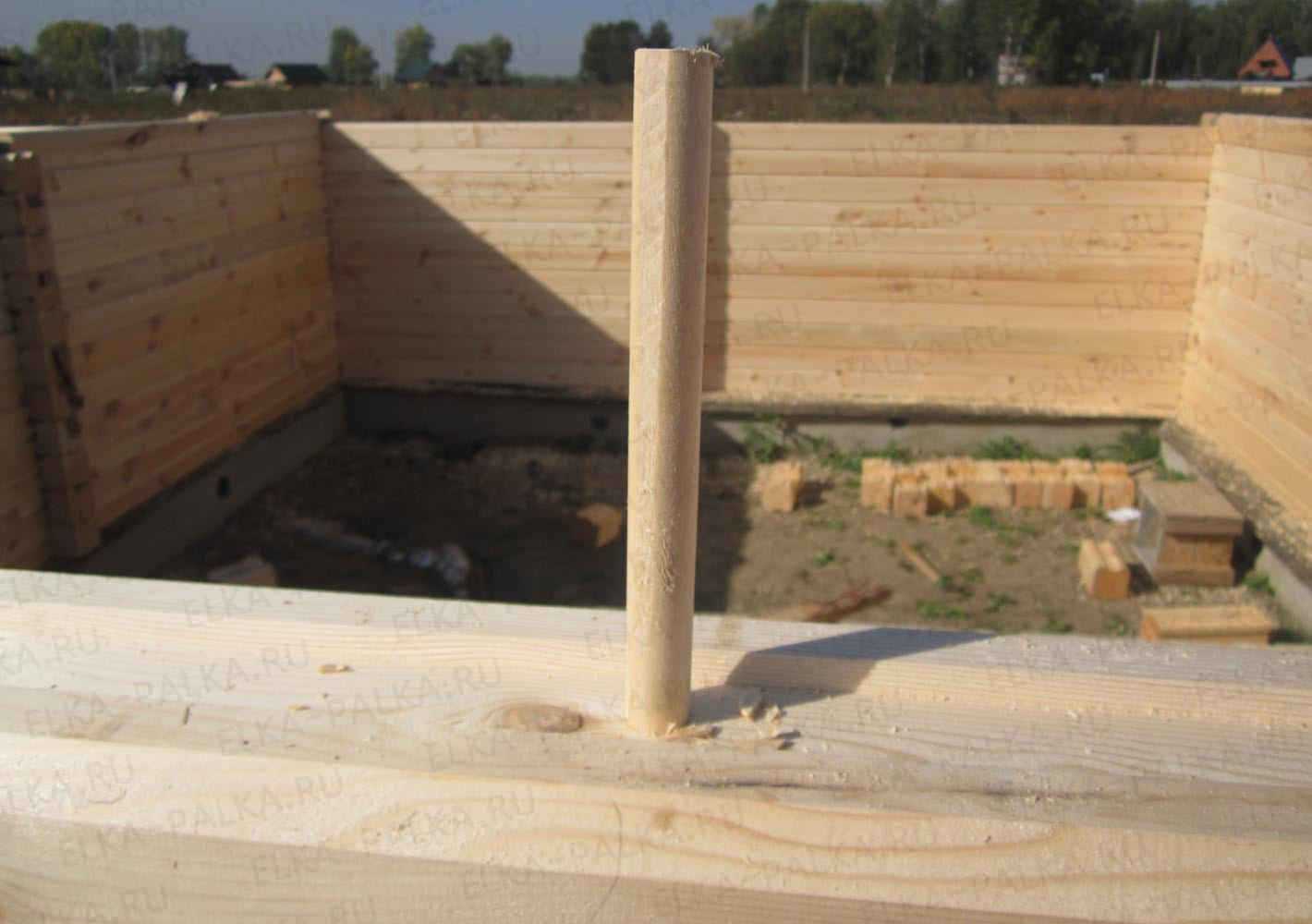 Деревянные нагеля можно изготовить из остатков бруса. Однако лучше всего выбирать плотную и водостойкую древесину, по типу лиственницы или осины. Подобные нагеля более прочные и невосприимчивы к плесени и грибкам. Деревянные нагеля перед работой нужно обязательно просушить. Их забивают в заранее просверленные отверстия, где они выравниваются по подходящему уровню влажности с брусом. В некотором роде деревянные нагеля «привариваются» к брусу, создавая с ним одну целую деталь. Образуется своеобразный скрытый компонент сруба.