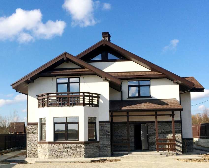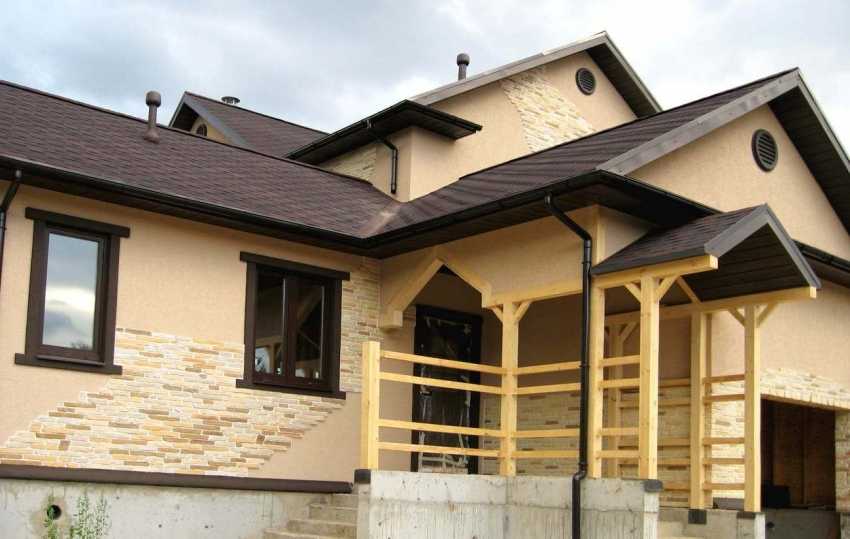 Вот еще один пример сочетания штукатурного и каменного фасадного дизайна. Крыльцо и чердачное помещение выполнено облицовочным материалом, тогда как все остальное пространство — штукатурный фасад.