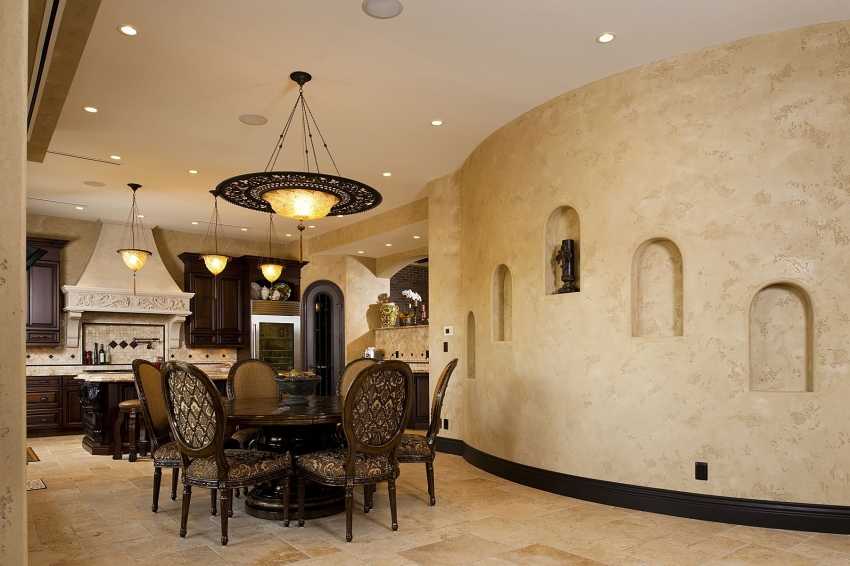 При нанесении декоративной штукатурки «короед» на поверхность, не следует слишком давить на кельму, поскольку чем дольше и тщательнее будет раскатан материал, тем менее заметным получится характерный рисунок. Поверхность в этом случае станет глянцевой, как при использовании венецианской штукатурки в интерьере дома, фото которого отображают данный эффект на поверхности стен.