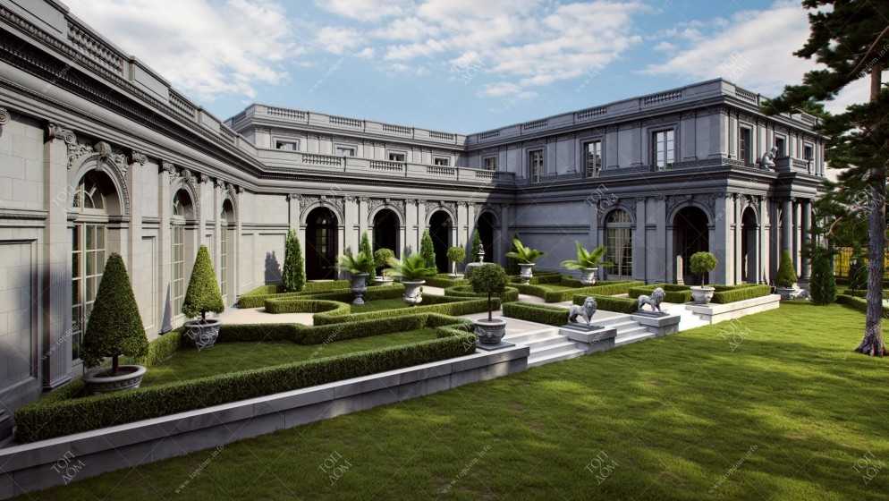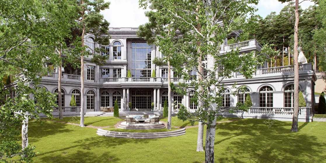 Проект величественного трехуровневого поместья, разработанный для строительства в лесном массиве, – пример того, насколько сильно дизайн кровли может определять идею экстерьера в целом. Каждый из надземных этажей имеет торцевые террасы и балконы, образуя четкий ступенчатый силуэт. А завершает пространственную композицию плоская кровля, оформленная балюстрадой.