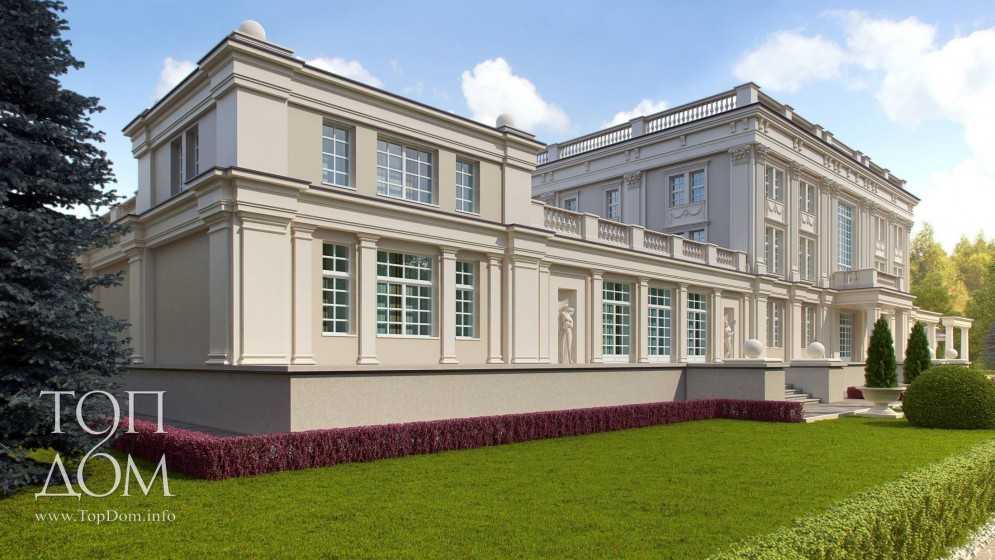 Мощный приземистый облик двухэтажного особняка в стиле неоклассика создается с помощью архитектурных элементов: колонн, фасадных скульптур, повторяющихся пилястр. Плоская крыша с парапетом венчает и основное здание, и примыкающее боковое крыло, и стоящий отдельно гараж, подчеркивая художественную целостность ансамбля.