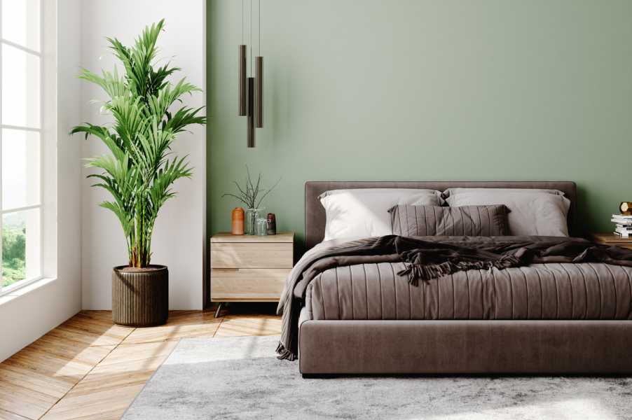 Старайтесь избегать насыщенных оттенков — они, как уже упоминалось, могут препятствовать полному расслаблению. Внедряя зеленый цвет в интерьер спальни, лучше отталкиваться от природной палитры, создавая естественную, легкую атмосферу.