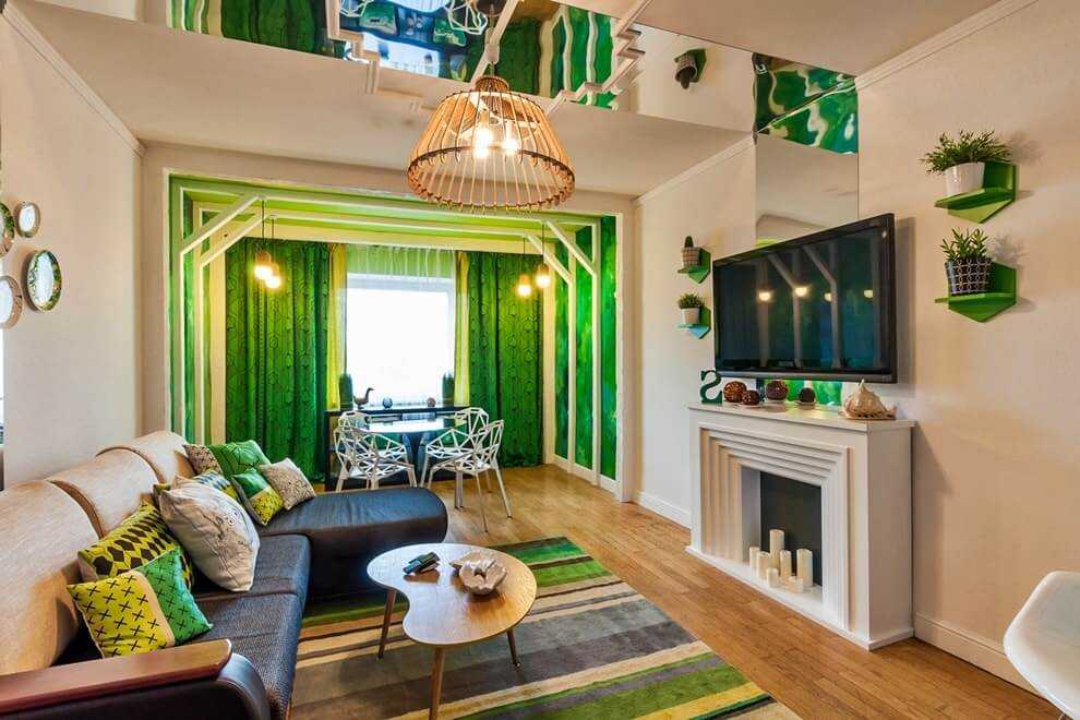 Гостиная — место отдыха, работы, общения и развлечений. Здесь человек, при стандартной планировке квартиры, проводит большую часть своей жизни, занимаясь важными (и не очень) повседневными делами. Поэтому тонизирующий, но в то же время умиротворяющий зеленый во всех его вариациях идеально впишется в такую комнату.