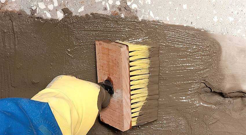 - На все поверхности наносится мастика. Только она должна отличаться по консистенции: жидкая для стен, густая — для пола.