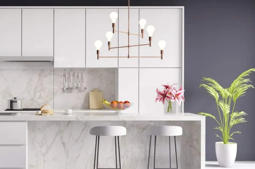 Нужно много естественного и искусственного освещения на кухне, так как работать придется с мелкими крупами, специями, острыми ножами и опасными блендерами. Оптимальное количество точек локального освещения – три. Одна – для рабочей зоны, вторая – для столовой, третья – для освещения антресолей и шкафов.