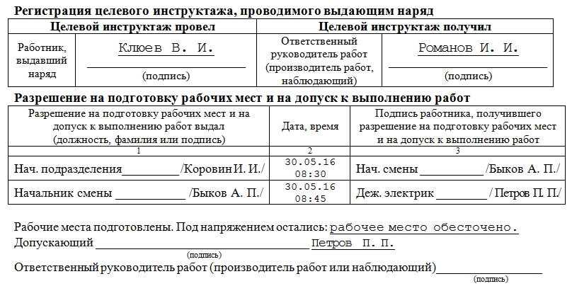 Под этой таблицей следует зафиксировать то, что рабочее место подготовлено к работе. Если какая-то часть электроустановки осталась под напряжением или не была обесточена – это нужно отметить. Затем допускающий сотрудник и ответственный руководитель ставят свои подписи.