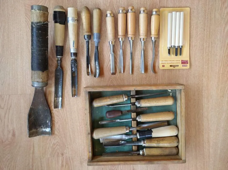 Такой набор для начинающих для резки по дереву удобен для резчика, делающего первые шаги; надо только убедиться в качестве ножей. По мере развития навыков набор будет расширяться; в него войдут тиски, дрель, пилы. Для первичной обработки древесины используют долото, пригодится и зубило, в том числе и полукруглое.