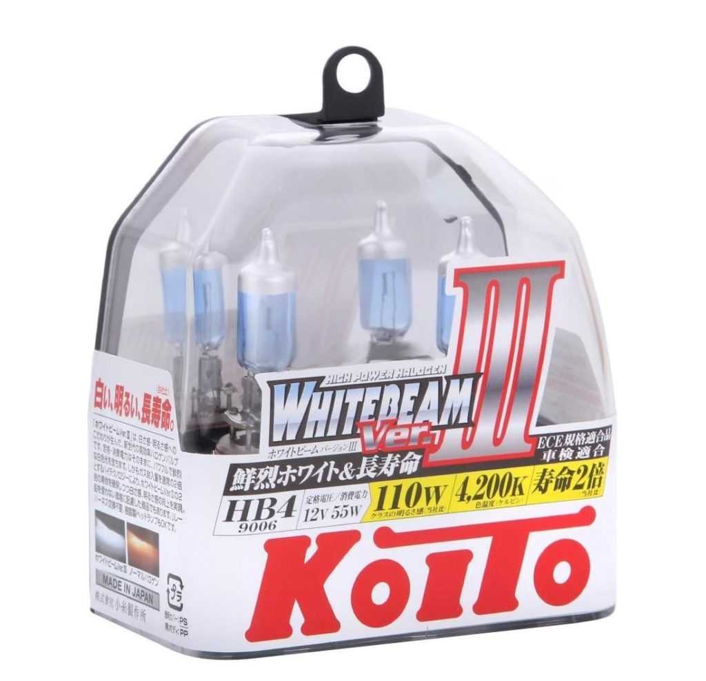 Данная галогенная лампочка предназначена для установки исключительно в легковые автомобили и обеспечивает высокий уровень безопасности во время передвижения по дороге. К основным особенностям прибора можно отнести способность «удвоенного свечения» с учетом стандартной мощности, а также повышенную яркость голубого света. Систему KOITO Whitebeam можно назвать высокотемпературной, так как во время функционирования газовый тепловой показатель превышает отметку в 4200 К. Примечательно то, что, несмотря на такой показатель, температура не превышает поставленные производителем значения. Приборам Whitebeam HB4 характерно высокое качество, надежность и долговечность.
