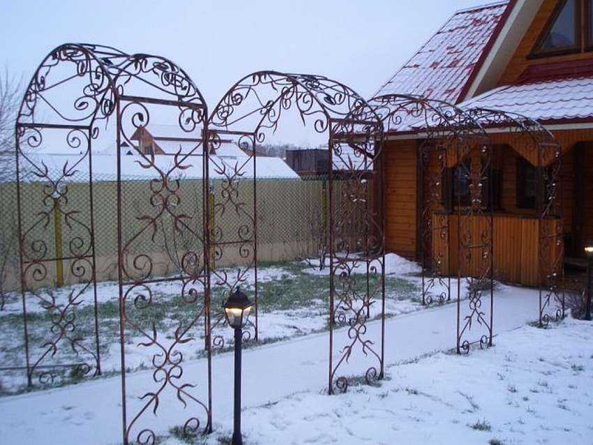Сделать арку из арматуры можно без изготовления колец. Изогнутые элементы соединяют прямыми отрезками, которые могут располагаться под разными углами к основным стержням. Для изготовления такой конструкции потребуется сварочный аппарат, поскольку прочно привязать прямые отрезки проволокой не получится. Более сложными в изготовлении являются конструкции с коваными или гнутыми элементами.