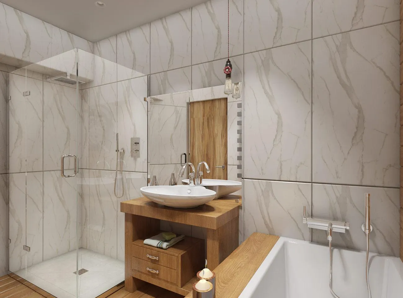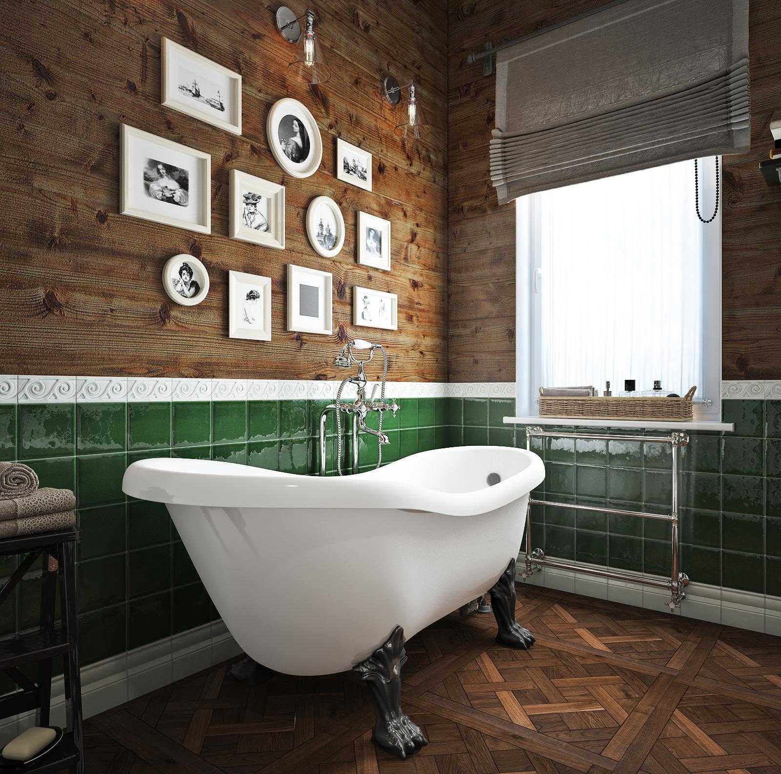 Традиционные покрытия стен и пола ванной комнаты – керамическая плитка, водоотталкивающая краска, искусственный или натуральный камень. Для выполнения отделки из дерева будут пригодны только влагостойкий сорт вагонки для бань или мореный дуб.