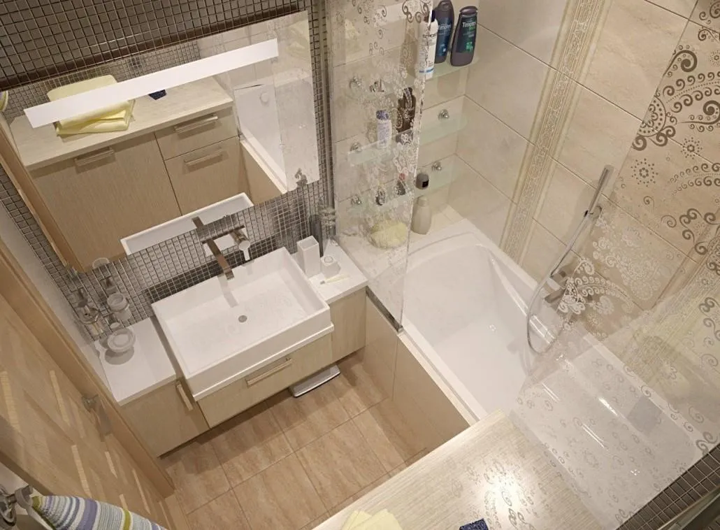 Любители горячих ванн могут радоваться, так как есть возможность вместить в такое маленькое пространство, ванну стандартных размеров или даже акриловую. Сэкономить площадь помогает душевая кабинка. А угловая кабинка, очень хорошо вписывается в интерьер, и освобождает больше полезной площади.