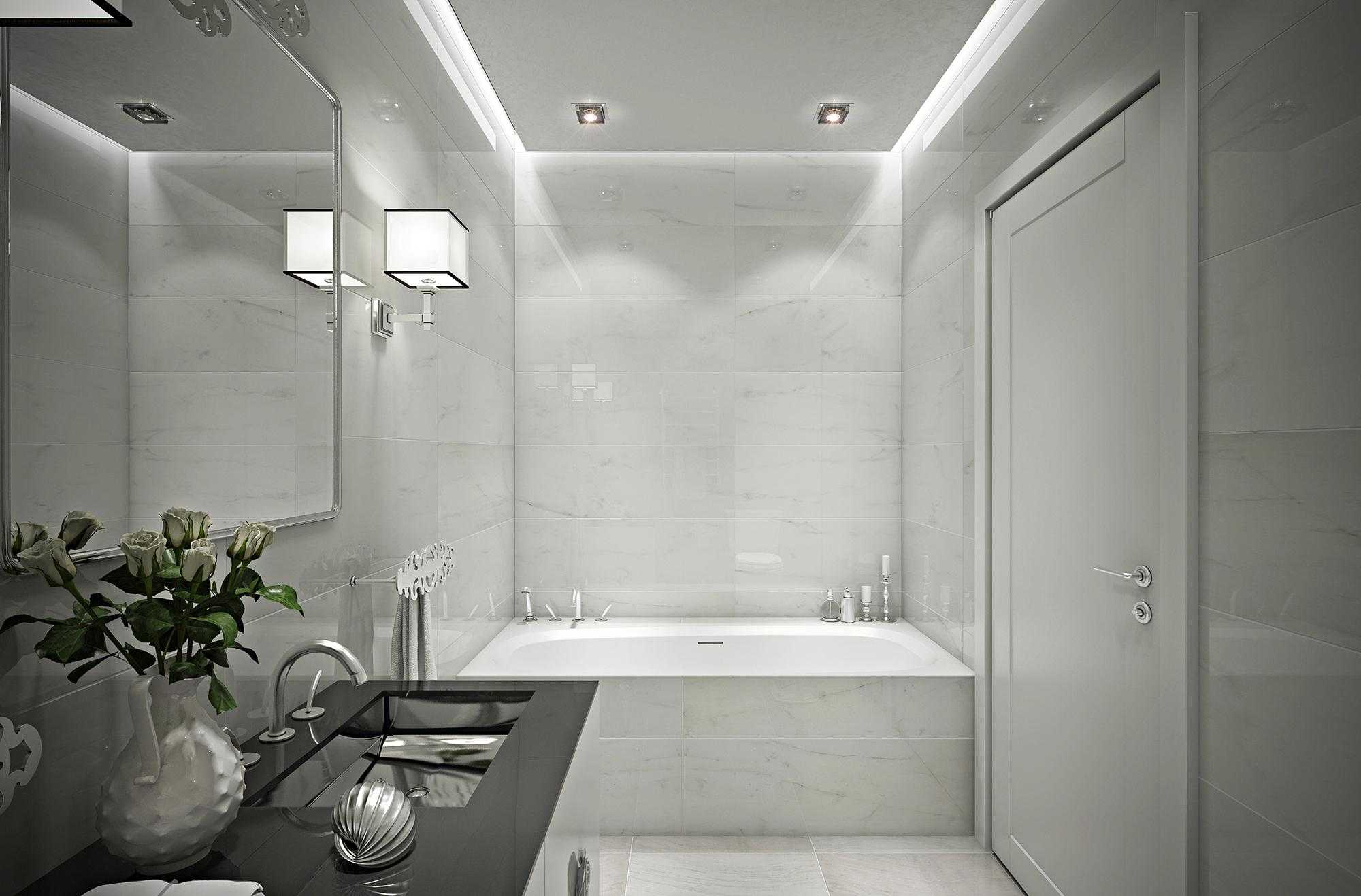 Точечные светильники добавят небольшому пространству уют. В создании дополнительного объема настоящей находкой может стать натяжной потолок со светодиодной лентой. Такое решение позволит визуально увеличить высоту ванной комнаты, добавит легкости и воздушности интерьеру.