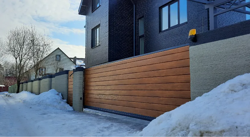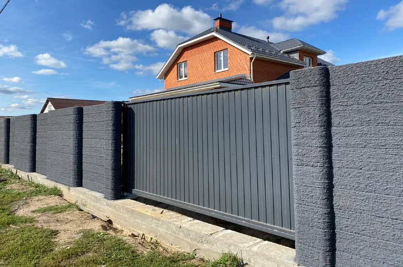 Крафтовый забор с откатными воротами, выкрашен в графитовый цветИсточник novacon.pro