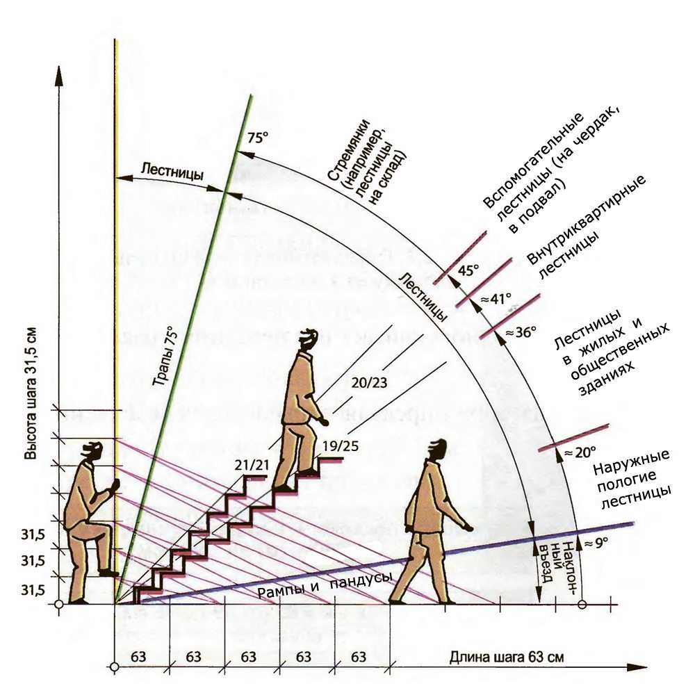 Угол наклона с учетом названных характеристик применяют от 25° до 45°. Чем больше высота ступеней, круче наклон лестничного марша, тем труднее им пользоваться.